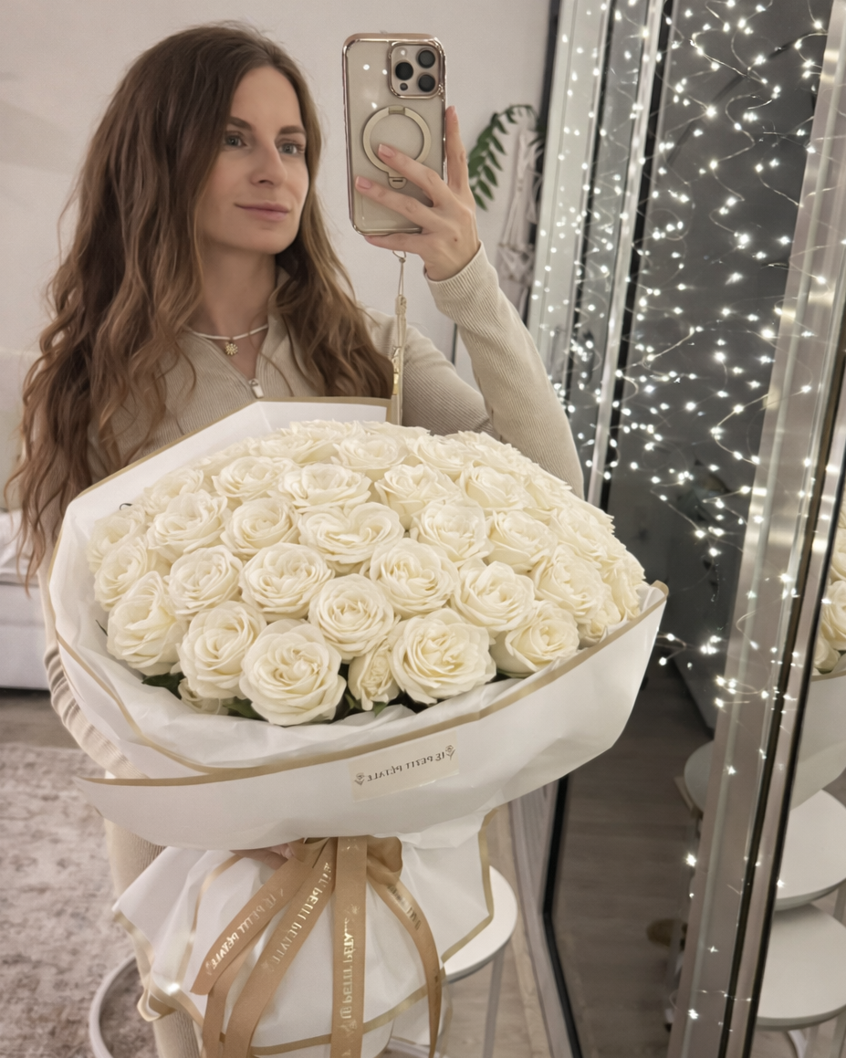 These pristine white roses symbolize loyalty, sincerity, and timeless love, creating a beautifully serene aesthetic. Each stem is carefully arranged to achieve a clean, airy composition inspired by French garden simplicity.